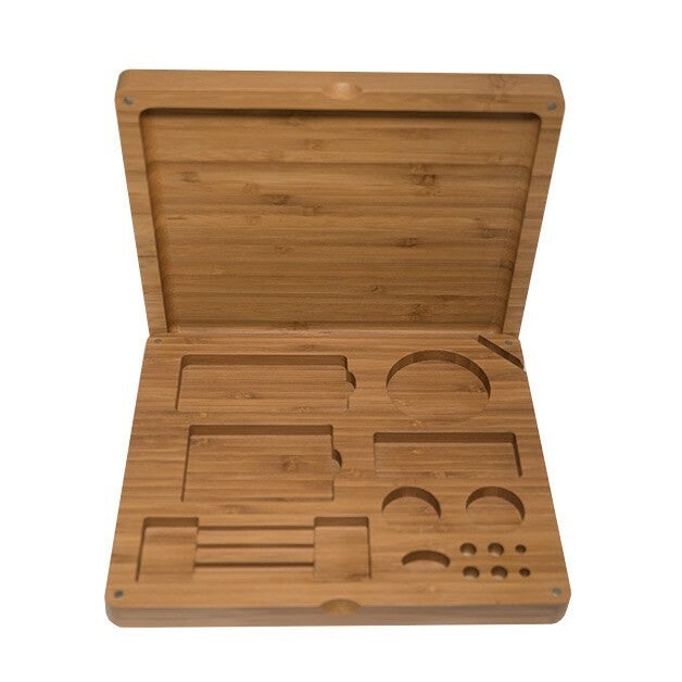 This joint rollers box from City Seeds Bank is made of tough Bamboo and comes with magnetic fasteners on each corner.And makes for an ideal compact storage of all ones smoke utensils. When flipped over the lid doubles and a perfect rolling surface.